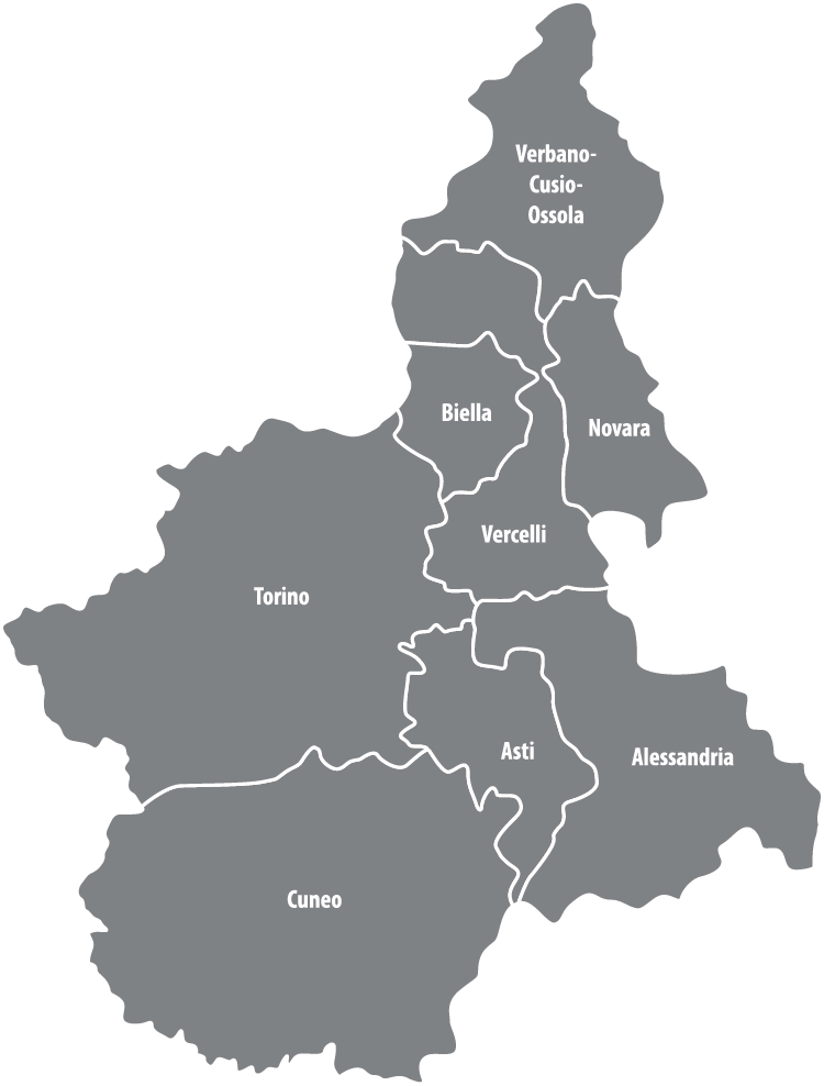 Die Region Piemont gliedert sich in die Provinzen Alessandria, Asti, Biella, Cuneo, Novara, Turin, Verbano-Cusio-Ossala und Vercelli.